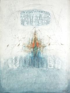 Mischtechnik/Papier, „Composition auf blauem Grund“, rechts unten sign und dat (19)85, Blattmaß 77 x 56,5 cm, montiert