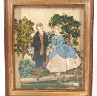 Historismus-Epoche, junges Liebespaar in Parklandschaft, Stoffcollage mit aufwändiger Stickerei, hangemalte Köpfe u. Hände, hG, HR, über alles 22 x 18,5 cm