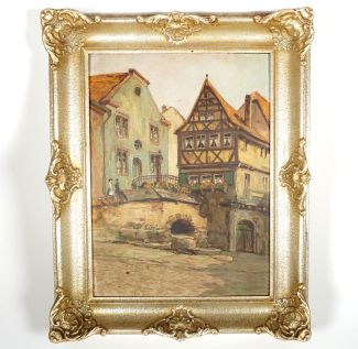 Düsseldorfer Schule, Öl/Hartfaserplatte, Brunnen in Rothenburg o.d. Tauber, rechts unten signiert u verso auf Etikett betitelt, ca. 40 x 30 cm, StuckGR