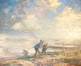 Öl/Holz, weite Nordseelandschaft mit netzeinholenden Fischern, rechts unten signiert, ca. 65 x 77 cm, StuckGR (dieser bestoßen)