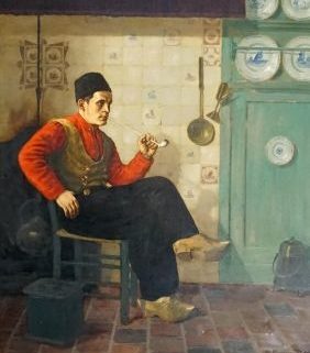 Öl/Lw., Pfeife rauchender niederländischer Bauer, rechts unten sign und bez Ddf., 81 x 71 cm, HR, rechts unten Loch in Lw. sowie mehrmals Farbschichtabrieb