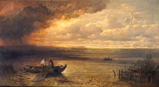 Öl/Lw doubliert, Aufziehendes Gewitter über herbstlichem See, Personenstaffage, rechts unten signiert u bez. München, ca. 72 x 132 cm, teilweise retuschiert