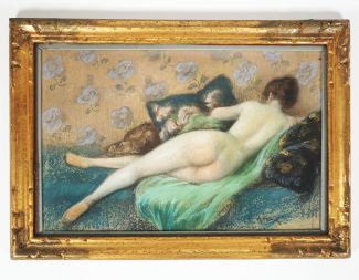 Pastell/Karton, Liegender Frauenakt, rechts unten sign und dat (19)21, verso versch Papieretiketten, 22 x 33 cm, hinter Glas, StuckGR (dieser besch)