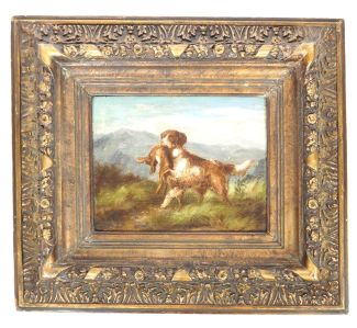 Öl/Holz, Jagdhund mit Jagdbeute Hase in bergiger Landschaft, links unten signiert, ca. 21 x 27 cm, alt retuschiert, StuckGR
