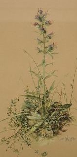 Mischtechnik, Gewöhnlicher Natternkopf, rechts unten sign und dat 1957, Ausschnittsmaß 36 x 18 cm, hinter Glas, PP, HR, gebräunt