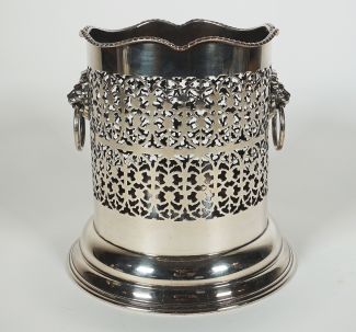 USA, durchbrochen gearbeitet, geschwungener Kordelrand, Löwenkopfhenkel, versilbert, Beschau, leicht gedellt, Dm. ca. 16 cm, H ca. 16 cm