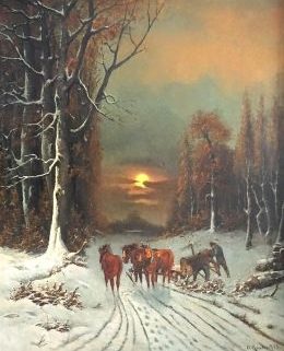 Düsseldorfer Malerschule, Öl/Lw., Holzfällerszene unter winterlicher Abendsonne, rechts unten sign., bez D. und dat (18)93, 93,5 x 76 cm, Lw verso verfärbt, HR (min best), 104 x 85 cm