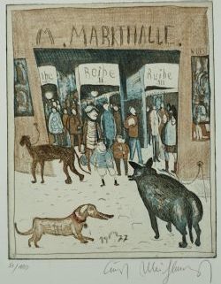 Farbradierung, „Marheineke Markthalle“, links unten numm 51/100 und rechts unten sign., in der Platte dat 1977 und monogr., Prägestempel, Blattmaß 39,5 x 35,5 cm