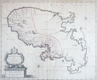 Martinique, „Insula Matanino vulgo Martanico“, wohl aus „Atlas Contractus Orbis Terrarum Praecipuas ac Novissimas Complectens Tabulas“, Amsterdam 2.H. 17.Jh., teilcolorierte Kupferstichkarte, Bugfalte, PP-Montage, Ausschnittmaß ca. 46,5 x 57 cm