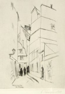 Radierung, „Paris. Rue St. Julien le pauvre“, links und rechts in der Platte druckbez, sowie unten rechts sign., Plattenmaß 24 x 18 cm, hinter Glas, Silberrahmen