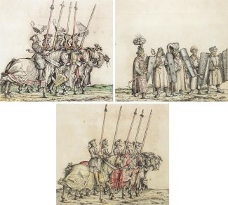 Hans , teilcolorierte Holzschnittem aus „Heerzug des Kaiser Maximilians“, Satz von 3, 2x oben rechts paginiert 39 bzw. 48, Abzüge des 18.Jh., Ausschnittsmaße ca. 36 x 38,5cm, hG, HR