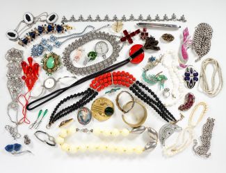 versch Manufakturen und Materialien, bestehend aus: 3 Pfauenbroschen, 5 Collier, 4 Gürtelschnallen, Gliederarmband, Silberreliefcollier, 7 Halsketten, 7 Broschen, 2 Armbanduhren, eine Taschenuhr, 3 Anhänger, Modebeschlag, Scharnierarmreif, Messingsprengarmreif, Geldklammer, Ring, Paar Ohrhänger, zwei Flachpanzerketten, Jadeanhänger, Minenhalter des Jugendstils und Filigrananhänger, Brosche mit Miniaturmalerei, tlw gemarkt