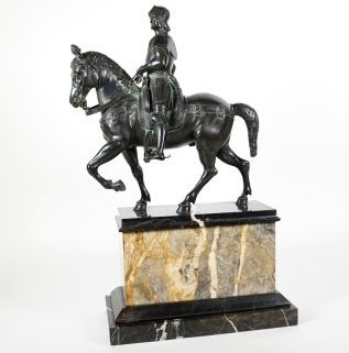 Historismus-Epoche, Bartolomeo Colleoni zu Pferd in Prunkrüstung mit Marschallstab, nach Andrea del Verrocchio (*1435 Florenz †1488 Venedig), mehrfarbiger Marmorsockel der Zeit (an 4 Ecken minimal altersbedingt bestoßen), ca. 57 x 36 x 19 cm, Zaumzeug u Zügel unbeschädigt, Paketversand nicht möglich