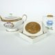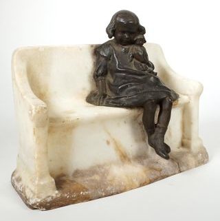 Anonymus, Anfang 20. Jh., Alabaster/Zinkguss bronziert (berieben), Mädchen mit Puppe auf Parkbank, über alles ca. 22 x 28,5 x 13 cm, verkratzt, verschmutzt, Riss