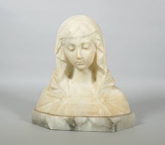 Büste der Maria im Stil der Renaissance, Alabaster, oktogonaler marmorähnlicher Sockel, dort signiert, über alles ca. 23,5 x 24 x 13 cm, teilweise kleinste bis kleinere Flohbisse