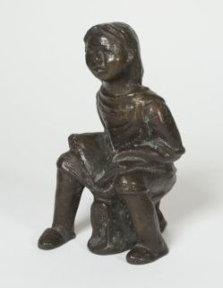 Bronze, patiniert, wartendes Mädchen auf Schultasche sitzend, signiert, ca. 14 x 7,5 x 9 cm