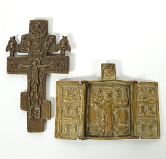Russland, 19. Jh., Triptychon, 2fach klappbar, 7 x 5,5 bzw 9,6 cm und orthodoxes Kreuz, Russland, Ende 19. Jh., 11 x 6,5 cm