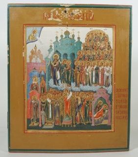Russland, 19. Jh., Gottesmutter Pokrov, 31 x 26 cm, zwei Sponki, besch, dazu Gutachten Ikonenmuseum Schloss Autenried bei Günzburg/Donau