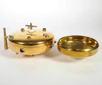 Herst. Alfons Böcker/Drensteinfurt, Messing poliert, Reste von Vergoldung, Beinfüße, im Ziborium in der Wandung u. Deckel versch. Steine in Zargenfassung, entspr. Griff, Kreuzknauf, 12 x 21 bzw. 6 x 14 cm