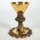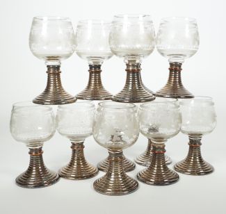 sog. Römergläser, Satz von 12, versilberter trompetenförmiger quer gerippter Schaft, Glaskuppa, umlaufend Weinranke im Mattschliff, H ca. 13,2 cm