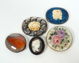 Konvolut von 5, 19./20. Jh., runde bzw ovale Form, versch Manufakturen und Stile, 3x Silberrahmen, 2x zentral Beinschnitzerei einer Rose, Lapislazuli und Lagenachatplättchen, Keramikplättchen mit Blumenmalerei und Kamee, Lagenachat, antikes Profil einer Frau mit Lorbeerkranz, 4 x 3,4 bis 5 x 6 cm, 1x MZ, Beschau, 1x Nadel rest