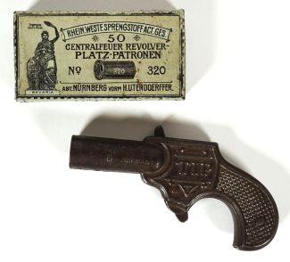 Herst. TIP, DRGM, 1. Hälfte 20. Jh., Blech, Mechanik gängig, L ca. 11 cm, Korken nicht anbei, dazu Metalldose, je altersbedingte Gebrauchsspuren