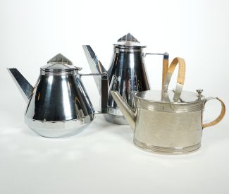 Herst. WMF bis 1919, i d Art von E. Kolbenheyer, Blech verzinkt, ovaler Stand, entspr. Wandung, Konustülle, Henkel u Griff mit Bastgeflecht, MZ, über alles ca. 15,5 x 20 cm, dazu Kaffee- u Teekanne, Jugendstil-Epoche, vernickelt, Holzgriffe, ungemarkt