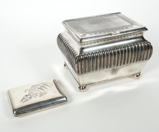 versilbert, rechteckige Grundform auf 4 Kugelfüßchen, konische godronierte Wandung, im Deckel graviert, 11 x 14 x 10 cm, dazu Zigarettenetui, versilbert, im Deckel Wappengravur, 9,5 x 7 cm