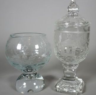 Konvolut von 2, farbloses Glas, versch Formen, je in der Wandung Freimaurersymbole, 1x Deckel, H. 15 und 24 cm, 1x am Rand Flohbisse