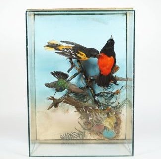 Präparator Adan Lizano/San José de Costa Rica, um 1900, 6 Vögel u. a. Kolibris, li. unten sign. u. bez., Holzplatte mit profilierter Leiste, Glaskasten, ungeöffnet, 45,5 x 35,5 x 16 cm, fleckig