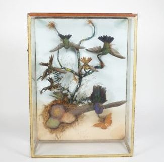 Präparator Adan Lizano/San José de Costa Rica, um 1900, 6 Kolibris u. 1 Schmetterling, unten mittig sign. u. bez., Holzplatte mit profilierter Leiste, Glaskasten, ungeöffnet, 45,5 x 35,5 x 16 cm, fleckig
