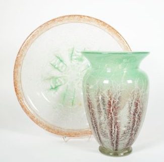 Herst. WMF/Geislingen, Serie Ikora, rot-grün bzw. orange-grün changierendes Glas, H 25,5 bzw. Dm 35,5 cm
