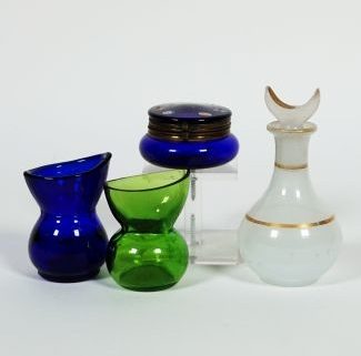 19./20. Jh., verschieden farbig, bestehend aus: 2 Augenbadewannen, Pillendöschen, Flakon mit Halbmond-förmigen Stöpsel (H 10 cm), tlw. polychrom gefasst, tlw. min. berieben