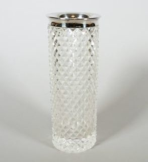 zylindrischer Bleikristallkorpus, umlaufend Rautenschliff, 835er Silberrandmontage, dort MZ, Beschau, sowie Widmung, H. 26 cm, im Stand materialbedingt drei kleinste Bestoßungen, gekugelt
