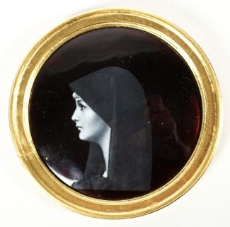 Heilige Fabiola nach Jean-Jacques Henner, Tondo, Emailleschmelz mit Malerei bzw. Umdruck, Goldleiste, Dm. Über alles 14 cm