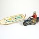 Holzgestell der 1930/50er, trapezförmige Grundplatte, Seifenwand mit Fenster, rückseitig Einbauschrank mit Schubladen, zentraler Tresen, div. Zubehör, meist 1950er ff., bespielt, 30 x 56 x 38 cm, Paketversand nach Absprache möglich