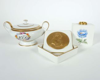 KPM/Berlin, je goldsilhouettiert, bestehend aus: Vase „Cadre“, in der Wandung Blumenhausmalerei, H 10 cm, quadratische Dose, im Deckel Flachrelief von Friedrich der Große nach J. G. Müller, 4 x 11 cm und Henkeldose, in der Wandung Blumenreserve mit Eigentümermonogr WFB, H 10 cm, je blaue Zeptermarke unter Glasur, 1x ein Schleifstrich