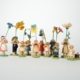 Sammlung von 11, Herst Wendt & Kühne/Grünhainichen bzw Expertic/Erzgebirge, Holz, gedrechselt/geschnitzt, polychrom gelackt, versch Figuren, he auf grüner Plinthe, H. 6 bis 15,5 cm, 6x Klebeetikett, tlw bestoßen/Lackabplatzer/1x stärker Blütenblätter fehlend