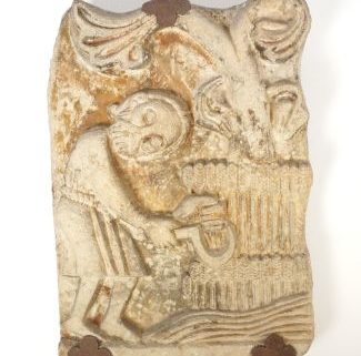 Replik nach einem gotischen Vorbild, Bauer bei der Getreideernte, Sandsteinguss, Eisenbeschläge als Halterung, 41 x 29 cm