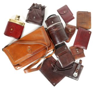 Manuf Aigner/München, 1970er/80er Jahre, versch eingefärbt, bestehend aus: Umhängetasche, Flachmann, Wecker mit Tasche, Flakontasche mit orig Flaschen, Necessaire, Schlüsselanhänger, 6 Brieftaschen und Etuis sowie ein Schreibblock, je Logoapplikation, tlw min Gebrauchsspuren