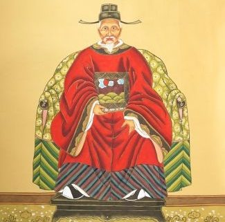 China, Ahnenportrait der Ming-Dynastie, Ausschnittsmaß ca. 59 x 45 cm, über alles ca. 99 x 51 cm, min. besch., oberer Abschluß eingerissen
