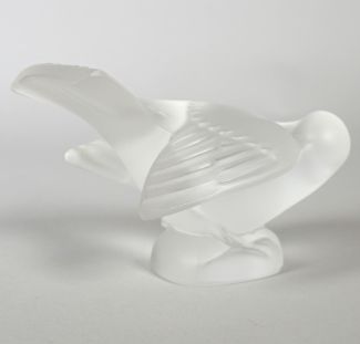 Spatz, sich putzend, Manuf. Lalique/Wingen-sur-Moder, satiniertes Glas, im Boden Ritzsignatur, ca. 7,5 x 7 x 12 cm, rechte Flügelspitze min. best.