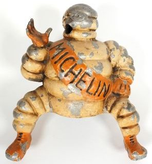 1930er Jahre, Frankreich, polychrom gefasster Aluguss (altersbedingt stärker berieben), Michelin-Männchen, Bibendum mit Michelin-Schärpe, ca. 21 x 17,5 cm