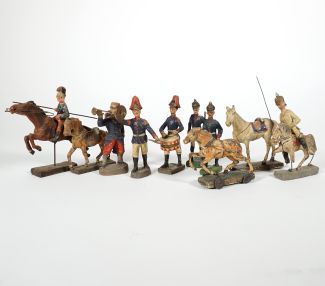 Konvolut von 12, 1904ff, Herst. Lineol/Brandenburg an der Havel bzw. Elastolin/Ludwigsburg, u.a. Soldaten, Reiter u. Pferde, tlw. stark bespielt u. besch.