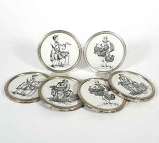 Satz von 6, 925er-Silberrandmontage, Porzellanspiegel, dort Umdruckdekore von Verkäufern: Wurst, Körbe u Vögel, je 2x, MZ, Beschau, Dm ca. 10 cm