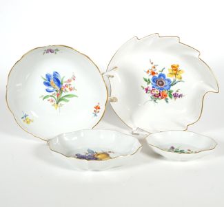 Konvolut von 4, Staatliche Porzellan-Manufaktur Meissen, bestehend aus: Blattschale, ca. 22,5 x 18 cm; runde Form; Rautenschälchen und Rautenschale, Fruchtdekor, je blaue Schwertermarke unter Glasur, 1. Wahl