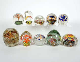 Sammlung von 10, wohl Böhmen, Brandenburg u. Deutschland, 1900er bis -70er, meist 1920er Jahre, div. Dekore: u.a. Stiel- u. Trompetenblumen, Baruther Blühmchen u. Spinne, 4x facettiert, H ca. 605 bis 10,5 cm, 1x Stoßstelle, 2x min. Oberflächenkratzer, tlw. min. altersbedingte Gebrauchsspuren (ex Coll. Peter v. Brackel)