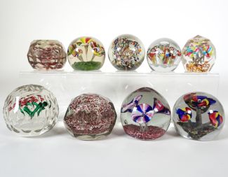 Sammlung von 9, meist Böhmen/Tschechoslowakei, darunter auch Schlesien, Deutschland u. Ungarn, ca. 1890-1930, meist um 1900, versch. Formen und Dekore, u.a. Trompetenblumen, Blasen, 4x facettiert, „Marie Brix“ aus Kupferdraht, Gravur „Emlék“ (Andenken), tlw. min. best., min. altersbedingte Gebrauchsspuren (ex Coll. Peter v. Brackel)