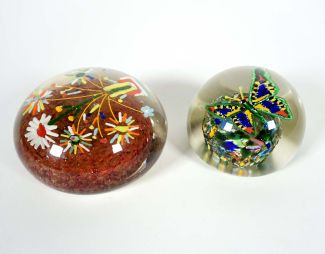 Konvolut von 2, wohl Böhmen u. Weißwasser, 1900er bis -30er Jahre, Bumenbouquet aus Glasfadenstücken mit Chromaventurin u. bunter Schmetterling aus Glasfadenstücken über buntem Kröselkissen, H ca. 5 bzw. 5.5 cm, min. Oberflächenkratzer (ex Coll. Peter v. Brackel)