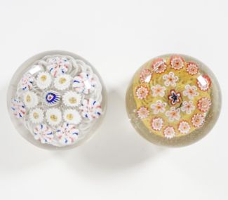 Konvolut von 2, wohl Schlesien o. Böhmen, ca. 1870-1905, je zwei Millefiori-Ringe um zentrales Cane über Doppenspiral-Latticinio-Grund bzw. über Doppelspiral-Filigran-Kissen, je min. altersbedingte Gebrauchsspuren (ex Coll. Peter v. Brackel)
